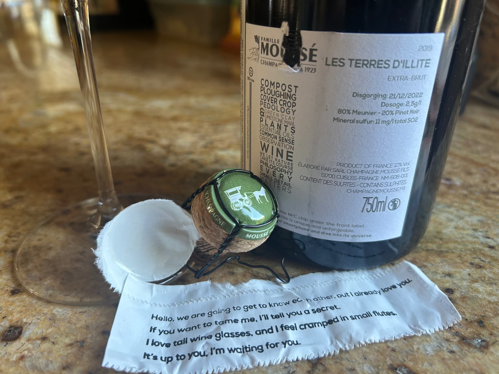 Disgorged December 2022. 2.5 grams of dosage (which is about 1/2 what it used to be just 5 years ago), composed of 80% Meunier and 20% Pinot Noir. Cedric seems to have changed the composition on the wine, increasing the Pinot Noir from the 5% that it was built on for so many vintages. First of two bottles, and actually the first bottle of Terre d'illite since I last finished my 2014s. Not sure why I lost track of the cuvee as it's been one I have liked for some time (I tend to prefer and gravitate to the no dose Les Vignes de Mon Village). Opened yesterday, revisiting today without food prior to dinner. Like yesterday, this is built on a juicy frame. Tangy, juicy peach is how the fruit comes, mixing with berry (kind of a strawberry/cherry), and what I just want to call a liquified red apple, which probably sounds strange yet that is how it resonates to me. What enamors me about this wine is the texture--it has a plush, juicy expression that just keeps pulling me back. There is acid here, but it's more of a support to the fruit, coming through in an orangey and apple skin way. My sense is that this is a better near-term drinker, yet delicious in how it shows now.