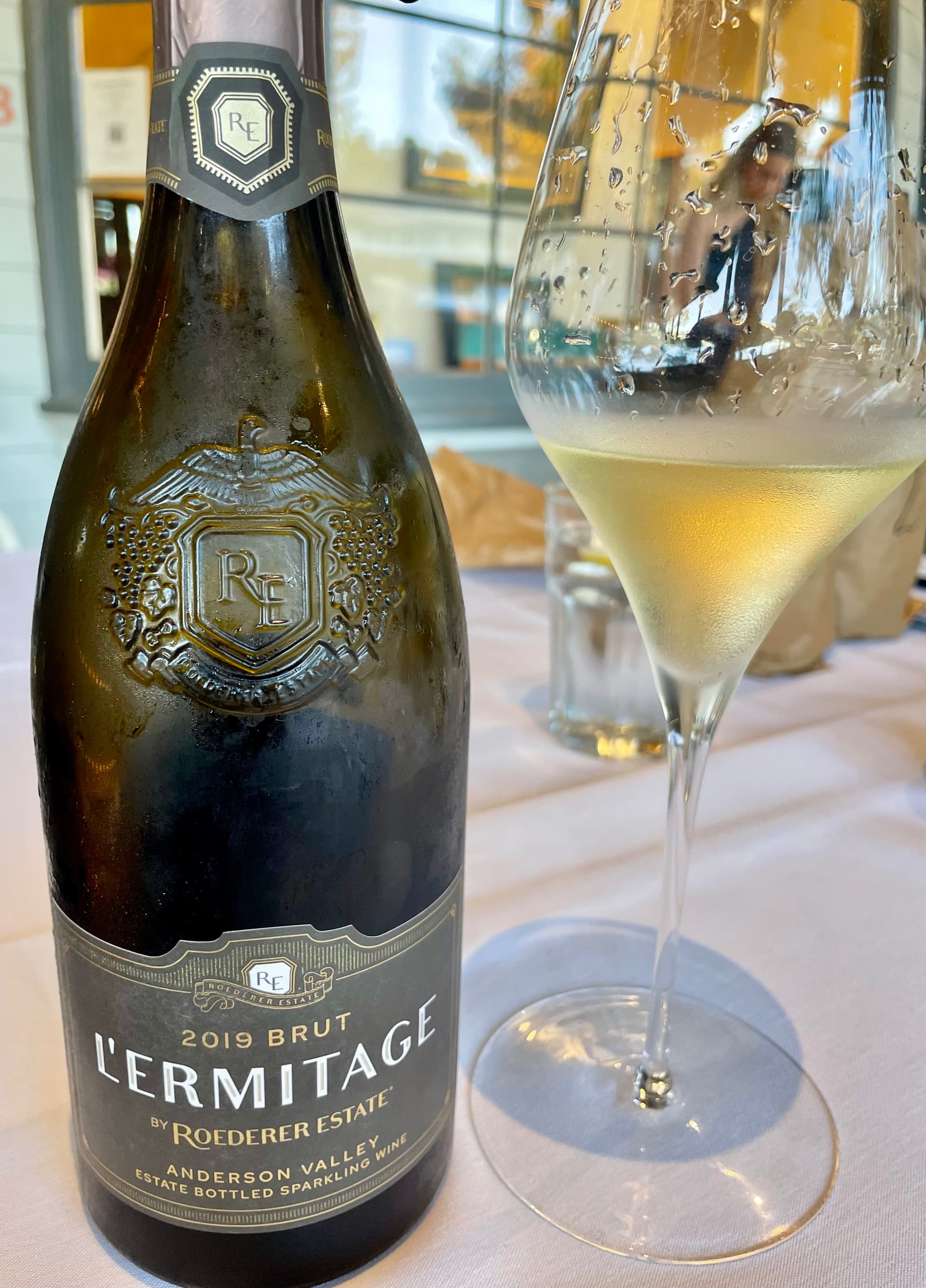 2019 ROEDERER ESTATE L’ERMITAGE ANDERSON VALLEY BRUT- served blind to the others; my bring and my first time tasting this release after having enjoyed many really good older vintages in the past; it had a light yellow color and mild aromas of fresh honeyed lemon, grapefruit and lime that made up the matrix of the taste profile that just gently burst on the palate once tasted; the frothy cotton candy like mousse perfectly complimented the elegance that this possessed all the way through; there was some body and weight, but overall, it was more about grace and charm; this was comprised of 52% Chardonnay and 48% Pinot Noir with 4% oak aged reserves from 2016 added; our bottle was disgorged 2/24 and dosed at 6 gpl. One of our members called it a new world sparkling wine from the outset and even mentioned this specific wine whereas the other 2 had it as small grower champagne.