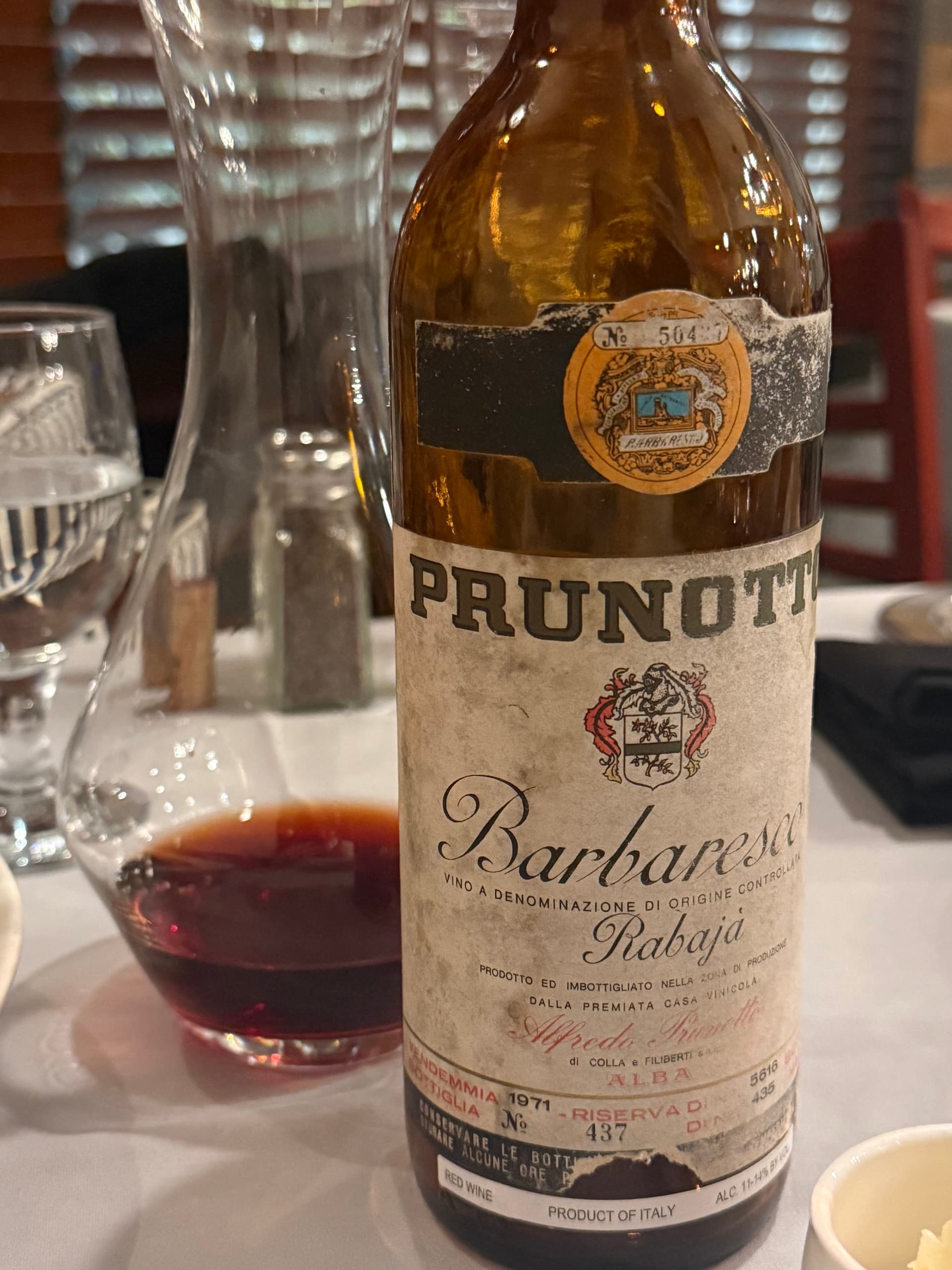 As you expect from Rabaja, fairly intense, dark fruited, dried roses, hint of tar that dissipated with air, slightly ferrous, lovely nots of cloves, and still fairly tannic. Decanted for sediment at 10am, left it in a wide based decanter for a bit, then let it slow ox until 5pm, before putting it back in a more narrow based decanter for an hourish. Left the rest of it to one of the owners at La Parma II in Huntington. He likely got the best of it, and it may have improved even through day 2, which is not uncommon of Beppe’s wines from that time period.