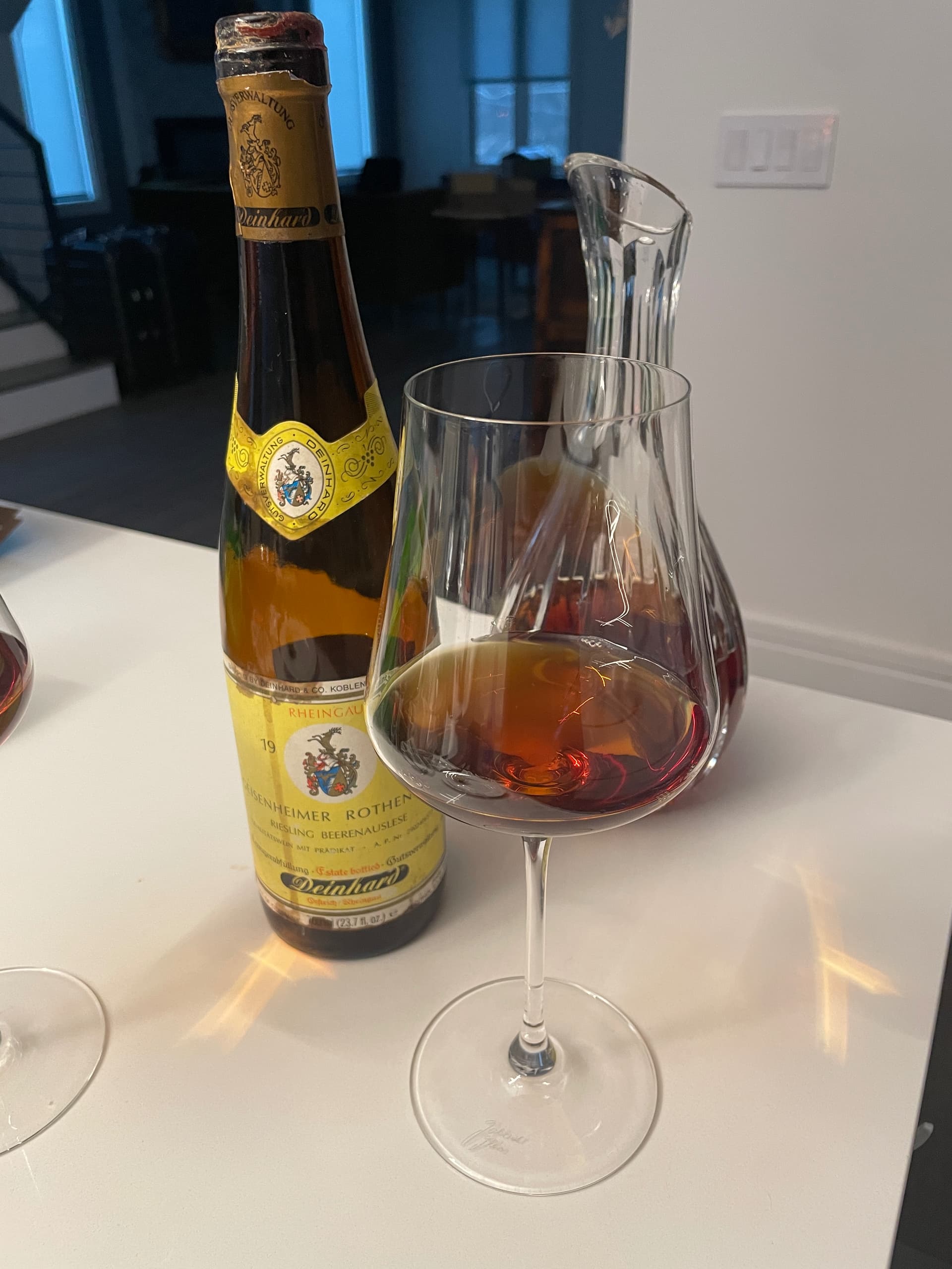 I love the orange marmalade quality — when it’s accompanied by sufficient acidity. Whatever flavor profile comes after orange marmalade in the ageing progression – that’s where I typically start to feel “past peak,” but I rarely have the patience and/or backfilling acumen to get there. This '05 Karthauserhof is definitely ready to go right now. Frustratingly, CT says I have another bottle at home, but I’m pretty sure I don’t – so that’s in line for the unfortunate Missing Presumed Drunk designation.