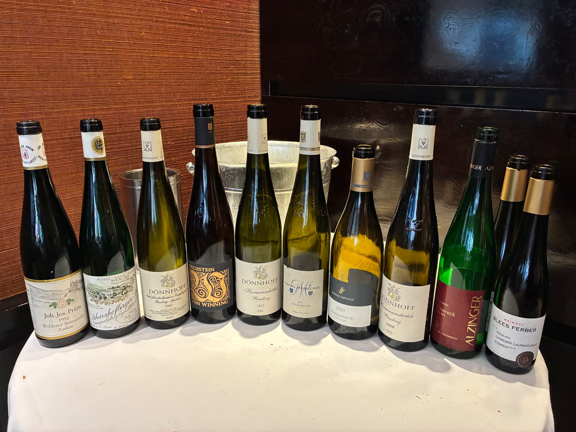 An all Riesling lunch just over a week ago. Prum auslese 1990, Muller spatlese and Donnhoff spatlese were an unusual flight to begin a meal with, but delicious and a really strong start. 2008 Donnhoff GG outshone the 2013 considerably. Two halves of eiswein to finish were magnificent.