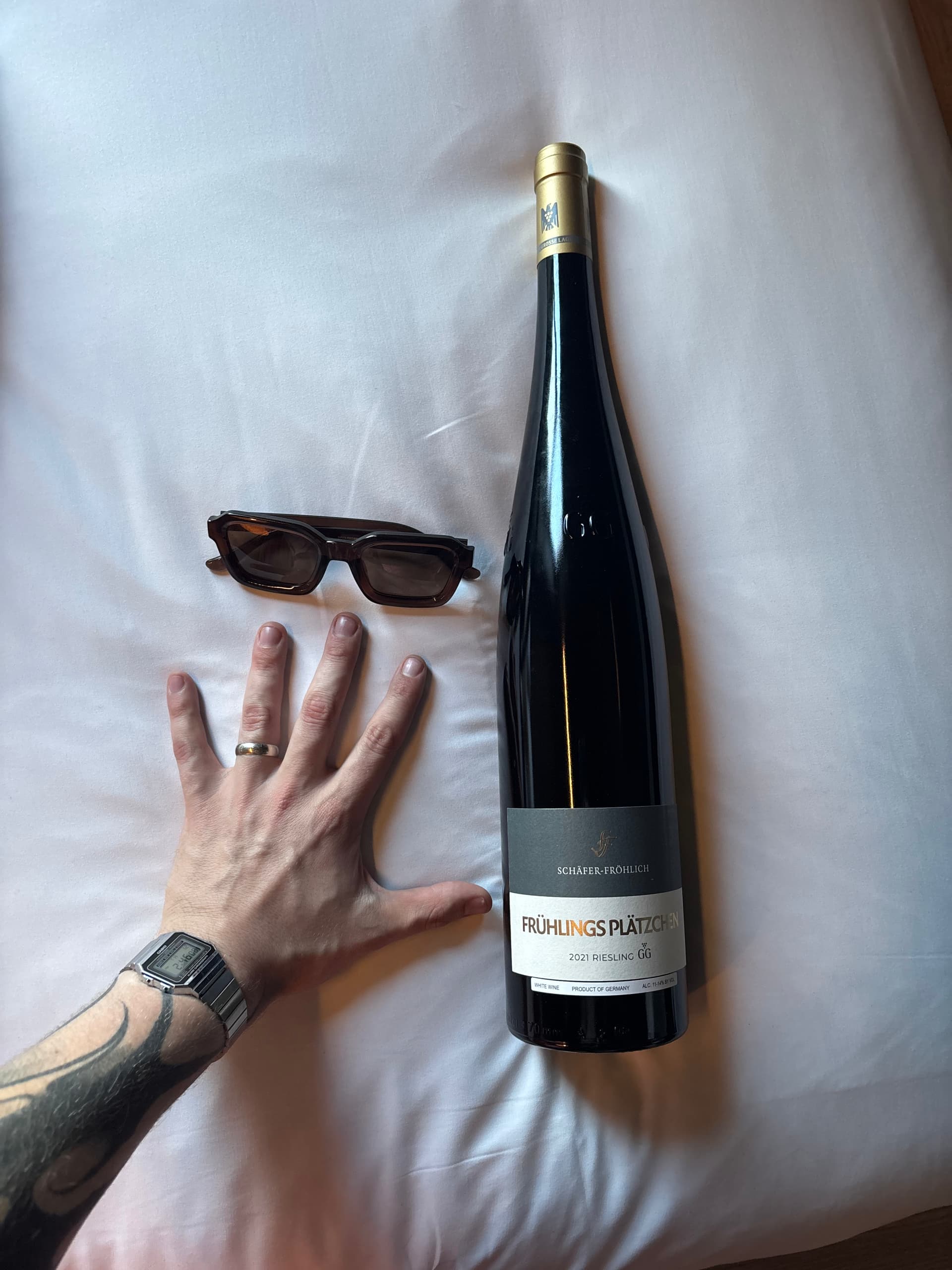Getting married later today and this is what I got for me and my fiancée to enjoy at dinner. Just added my hand for scale. Never held a Riesling mag before and it’s making me laugh how big it is lol