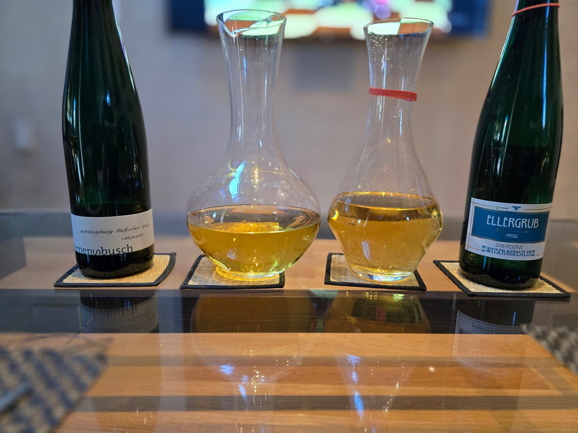 Sarah, is the rubber band on the decanter and bottle to keep track of which is which? What a useful system. I usually rely on memory and, all too often, deductive tasting.