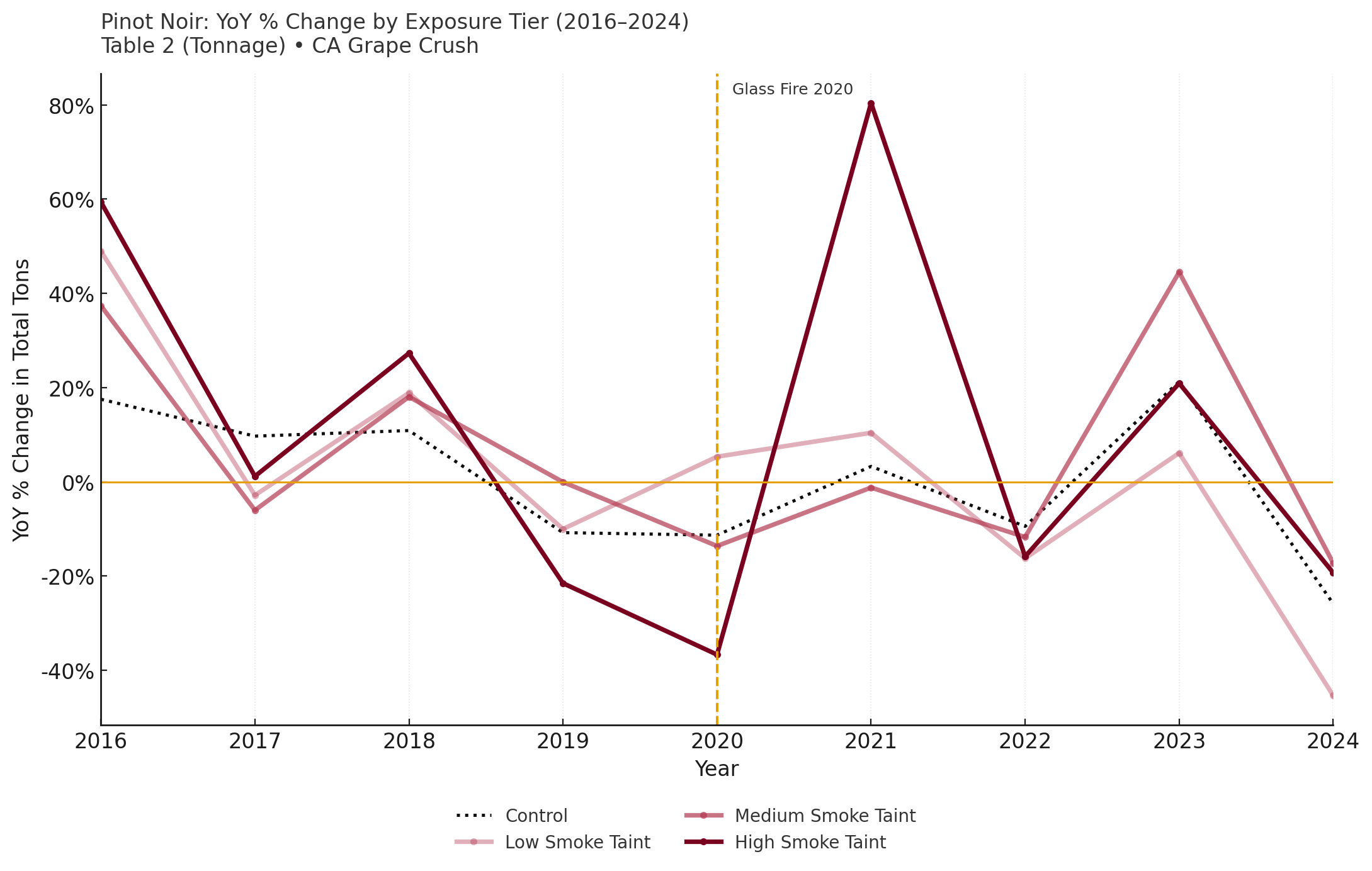 Supply: For all three reds, tonnage contracts sharply in 2020, especially in higher-exposure districts, consistent with smoke-taint-related non-harvests and discounting.