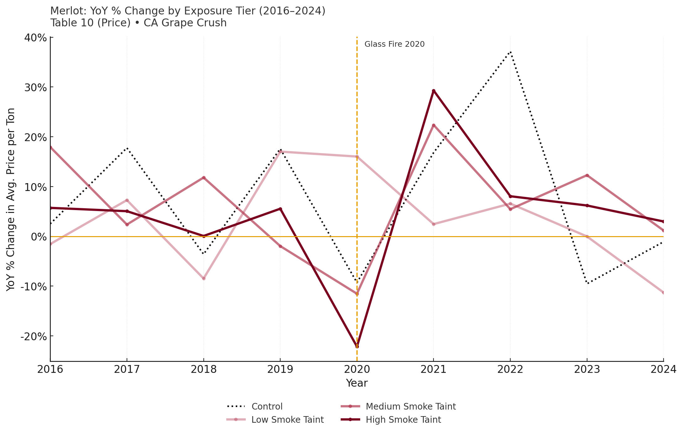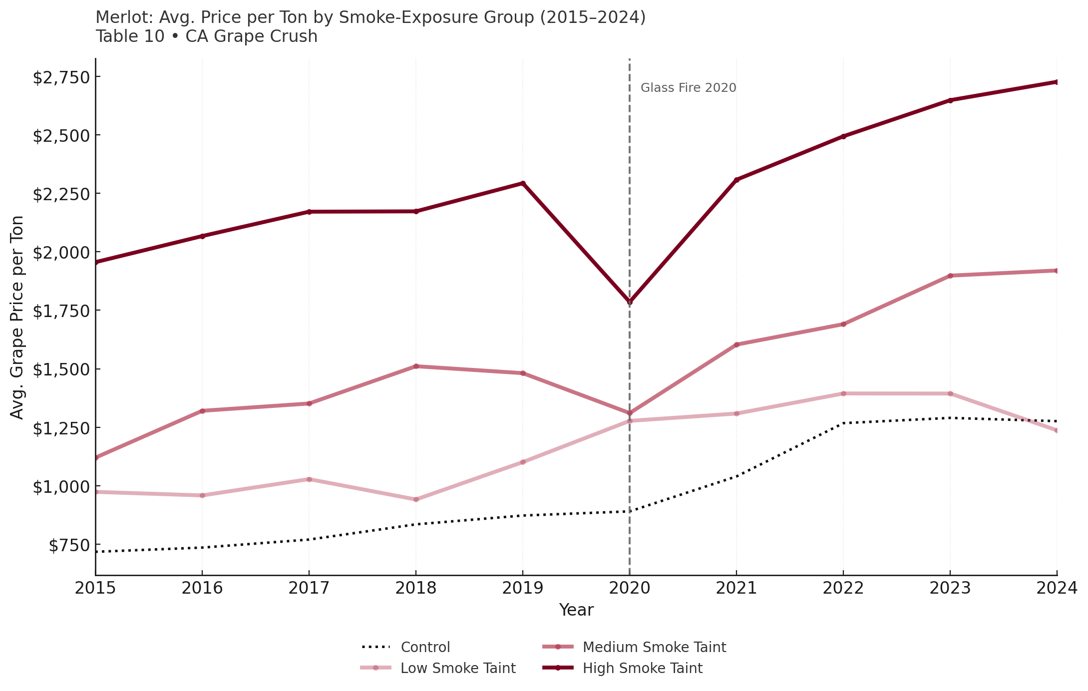 Below are seven descriptive figures using California Grape Crush data (2015–2024) for Pinot Noir, Cabernet Sauvignon, and Merlot. Districts are grouped into Control / Low / Medium / High exposure tiers based on 2020 smoke impact. These are descriptive, not causal, and shown alongside broader market context via the Liv-ex 100.
