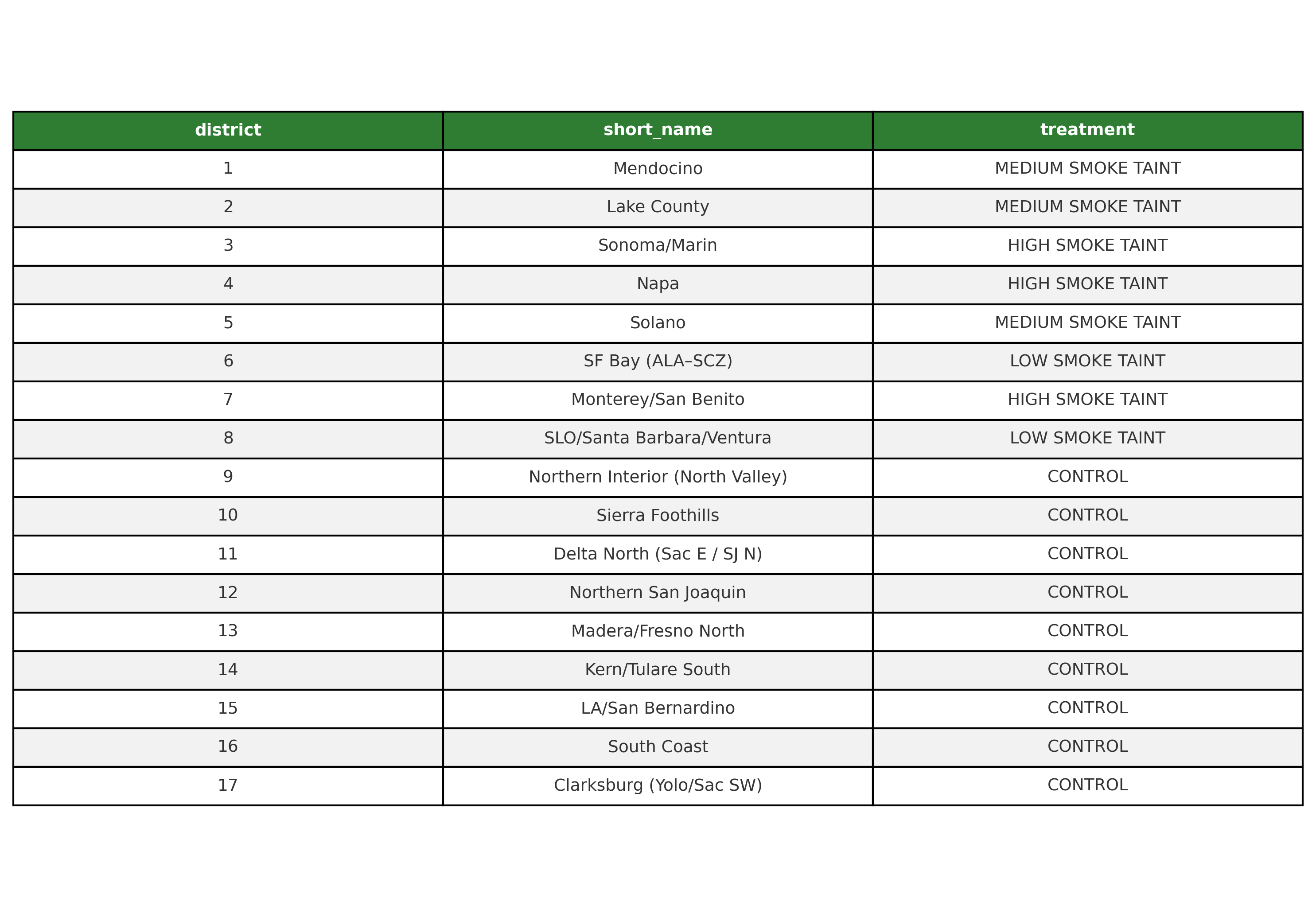 Here is how our treatment groups are initially defined. You’ll notice Napa, Sonoma, and Monterey are the only districts included in the HIGH group as they were the most affected by smoke taint.