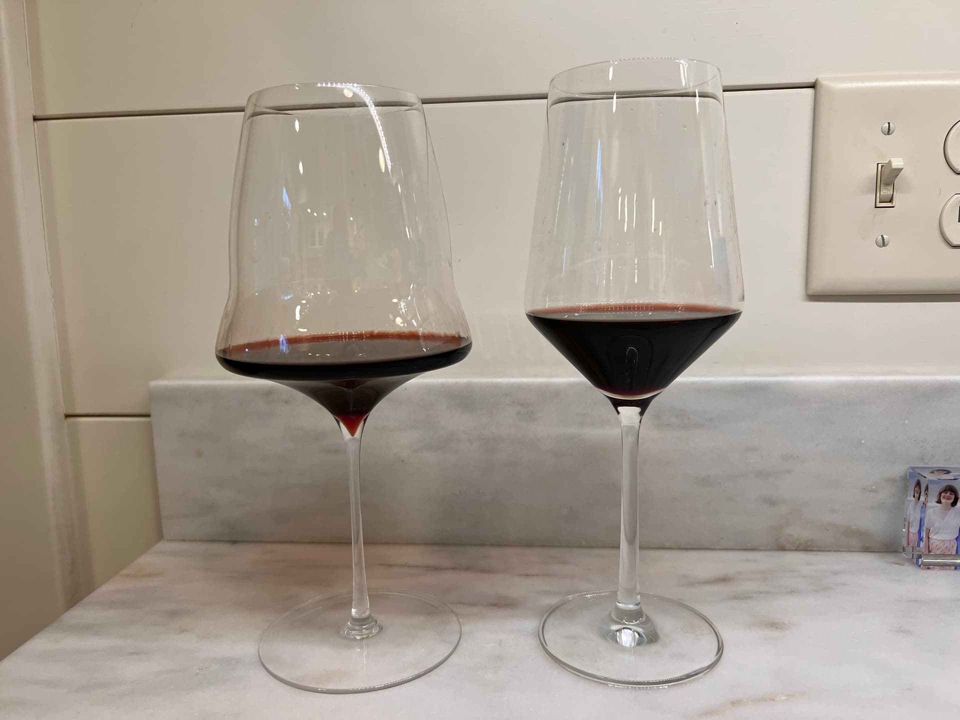 Some random thoughts. I really like these for large glasses. I think the traditional shape, at a large size, can feel kind of unwieldy/oversized - where these have a certain poise to them. They are very, very lightweight given their size, and feel delicate, but somehow not fragile. As others have said they sort of have a face only a mother could love, and yet I do find them graceful and attractive. Some other unusual glasses make me wince but these I actually like. If you’re so uncouth as to hold the bowl rather than the stem (I do, sometimes), the “crease” makes a really comfortable spot for your thumb.
